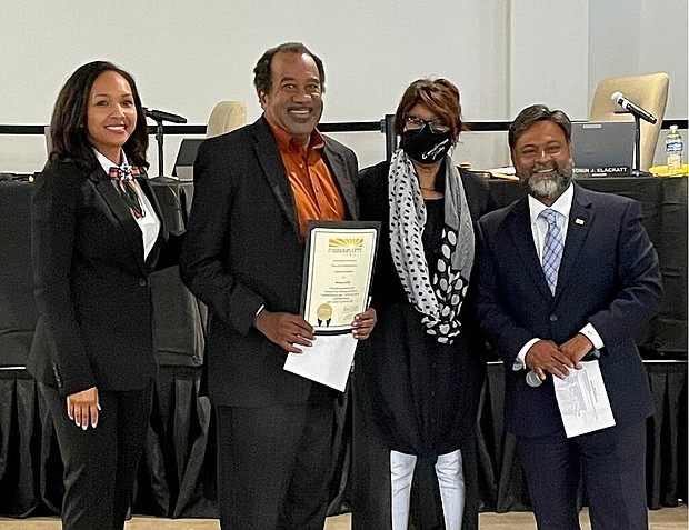 Rodney Griffin was appointed by the City of Missouri City Mayor and Council to the nine member Planning and Zoning Commission, June 7, 2021. Griffin was sworn in by Mayor Robin Elakatt before a packed house. Council Members Lynn Clouser( L) and Dr. Cheryl Sterling are present in the photo.