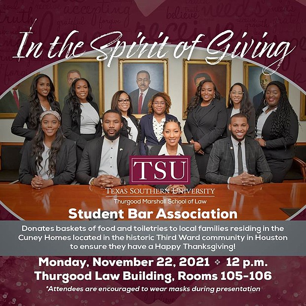 Texas Southern University Thurgood Marshall School of Law Student Bar Association Board of Directors transcend compassion and TSU Tiger pride on the brink of Thanksgiving holiday,