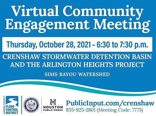 Mayor Pro Tem Dave Martin would like to remind Arlington Heights and Edgebrook area residents Harris County Flood Control District and Houston Public Works will be hosting a virtual community meeting on Thursday, October 28, 2021, at 6:30 pm to discuss the Arlington Heights Area Drainage Improvements and the Crenshaw Stormwater Detention Basin Projects.