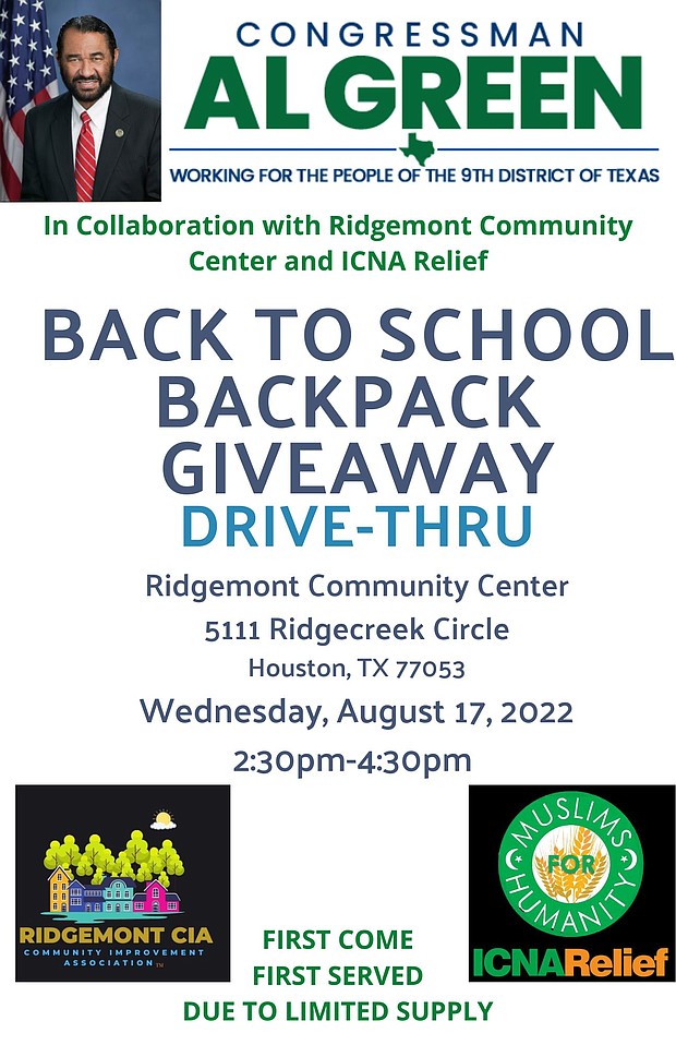 On Wednesday, August 17, 2022, Congressman Al Green will host a back-to-school backpack giveaway. He is honored to be partnering with local organizations Ridgemont Community Center and ICNA Relief for this back-to-school-drive.