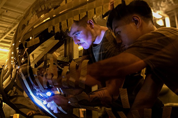 Aviation Structural Mechanic (Safety Equipment) 2nd Class William Peek, left, from Olathe, Kan., and Aviation Structural Mechanic (Safety Equipment) 3rd Class Gervin Flores, from Houston, perform maintenance