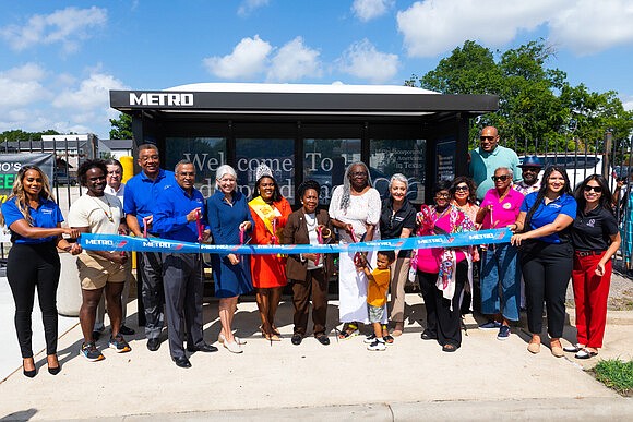 METRO Board Members and staff along with U.S. Rep. Sheila Jackson Lee, Houston City Council Member Karla Cisneros and leaders from the Independence Heights neighborhood cut the ribbon on new bus shelters designed in partnership with the community.