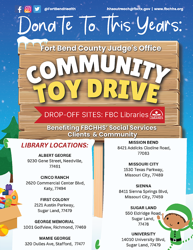 Join Fort Bend County Judge KP George's Annual Community Toy Drive, bringing joy to Fort Bend County Social Services families at the Rosenberg Annex on December 15 – donate unwrapped toys at multiple locations, including Fort Bend County library branches, by December 13 to spread holiday cheer.