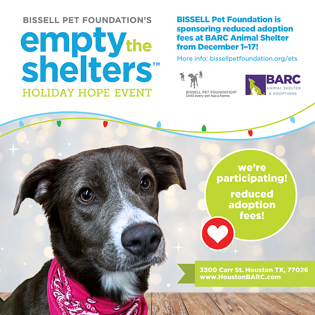 The holidays are a time of joy, love, and togetherness, and what better way to celebrate the season than by giving a homeless pet the greatest gift of all—a forever home? This December, BARC, the City of Houston's Animal Shelter and Adoption Center, is teaming up with the BISSELL Pet Foundation to bring hope and second chances to countless stray pets through the *Empty the Shelters™* initiative. From December 1 through December 17, BARC will join over 400 shelters across 45 states to offer reduced adoption fees, making it easier than ever to bring home a furry friend.