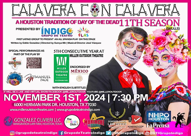 Grupo de Teatro Indigo returns to Miller Outdoor Theatre on November 1st for the 11th season of *Calavera con Calavera*, an acclaimed Day of the Dead play celebrating Mexican heritage with live performances and cultural artistry.